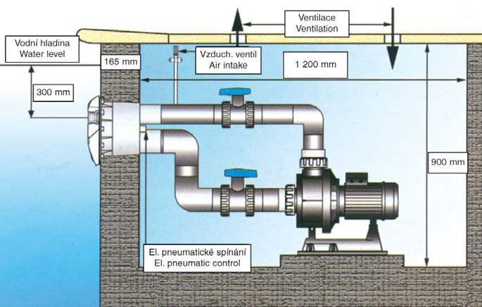 Protiproud V-Jet je určen pro vestavění (zabetonování) do těla bazénu, čerpadlo a potrubí se umisťuje do šachty za bazénem. Zařízení je dodáváno jako kompletní sestava.